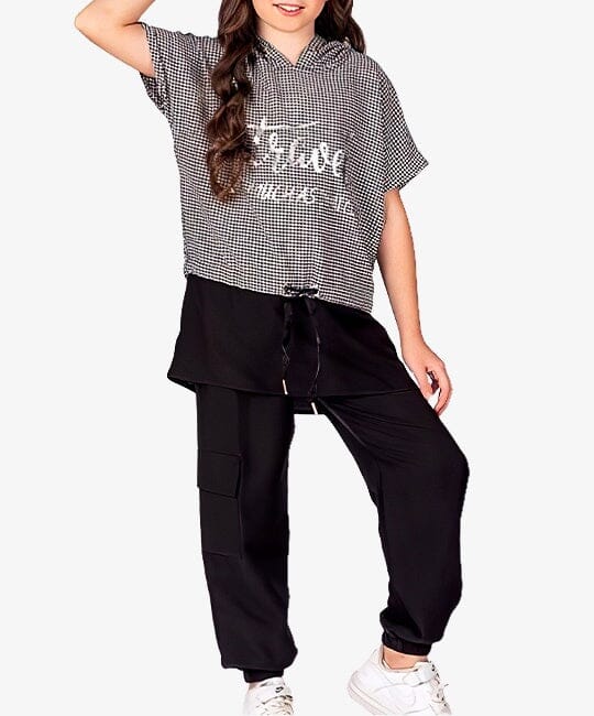 The set consists of 2 pieces, featuring a cap-sleeve square-patterned T-shirt with